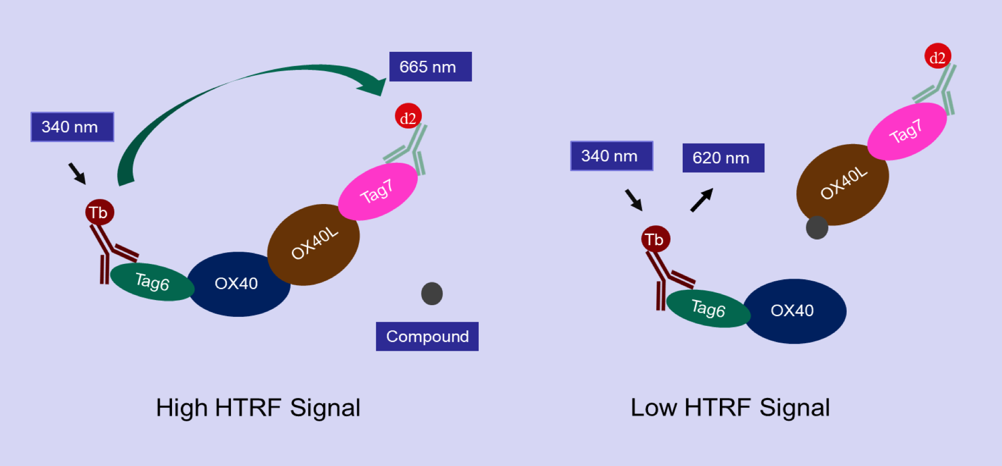 Our OX40-OX40L binding assay kit is a TR-FRET based assay designed to detect the binding status between OX40 and OX40L. Tag5-OX40 and Tag7-OX40L are included in this assay kit. Binding of Tag5-OX40 to Tag7-OX40L brings the Terbium (Tb, HTRF donor) and the fluorophore d2 (HTRF acceptor) into proximity, and activation of Tb results in fluorescence resonance energy transfer (FRET). Therefore, the binding status can be quantitively measured by calculating the ratio of the emission fluorescence intensity of the acceptor (665 nm) and donor (620 nm). Disruption of OX40-OX40L binding will reduce the HTRF signal.