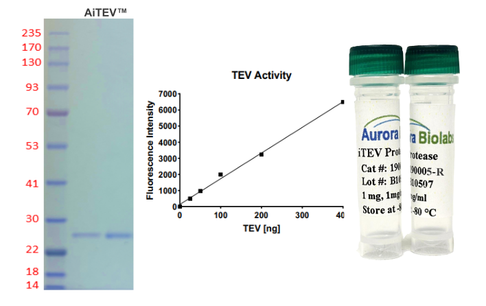 Tobacco Etch Virus nuclear-inclusion-a endopeptidase or TEV is highly sequence specific cysteine protease. It has a strict 7 amino acid cleavage recognition sequence of Glu-Asn-Leu-Tyr-Phe-Gln ↓ (Gly/Ser). The high specificity makes this protease excellent for the removal of affinity-tags from purified recombinant proteins. Purified TEV was expressed in E.coli and is shipped in 4°C packaging to preserve activity. TEV cleavage is best performed at room temperature in a P.H range of 4 – 9. AiTEV Protease is an improved version of Tobacco Etch Virus (TEV) protease that is highly site-specific, highly active, and significantly more stable than native TEV protease, resulting in enhanced long-term activity.